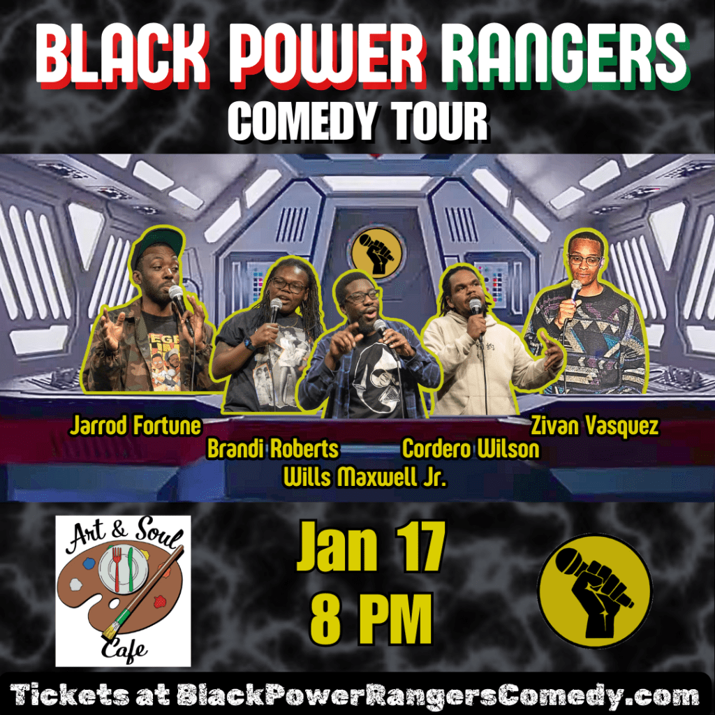 The Black Power Rangers are a group of sharp, insightful, Black comedians from the South. Come laugh as they effortlessly weave social commentary with pop culture for a uniquely hilarious show. Featuring stand-up from Wills Maxwell Jr. (Wilmington, NC), Brandi Roberts (Raleigh, NC), Cordero Wilson (New York, NY), Jarrod Fortune (New York, NY), and special guest Zivan Vasquez (Pittsburgh, PA). This is a show you can’t miss.
